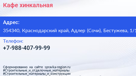 Кафе-хинкальная по адресу 354340, Краснодарский край, Адлер (Сочи), Бестужева, 1/1 в дальнейшем Организация, размещена в следующих категориях: