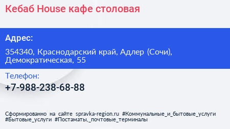 Кебаб House, кафе-столовая по адресу 354340, Краснодарский край, Адлер (Сочи), Демократическая, 55 в дальнейшем Организация, размещена в следующих категориях: