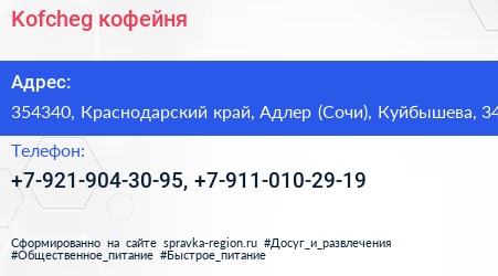Kofcheg, кофейня по адресу 354340, Краснодарский край, Адлер (Сочи), Куйбышева, 34 в дальнейшем Организация, размещена в следующих категориях: