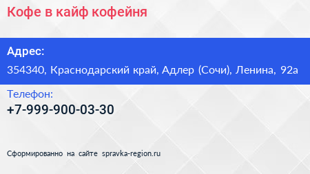 Кофе в кайф, кофейня по адресу 354340, Краснодарский край, Адлер (Сочи), Ленина, 92а в дальнейшем Организация, размещена в следующих категориях: