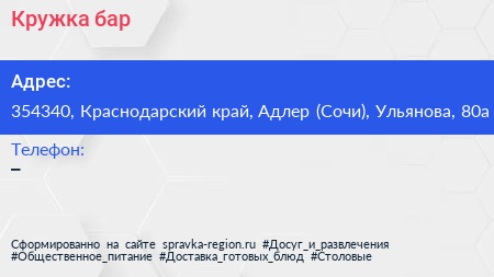 Кружка, бар по адресу 354340, Краснодарский край, Адлер (Сочи), Ульянова, 80а в дальнейшем Организация, размещена в следующих категориях: