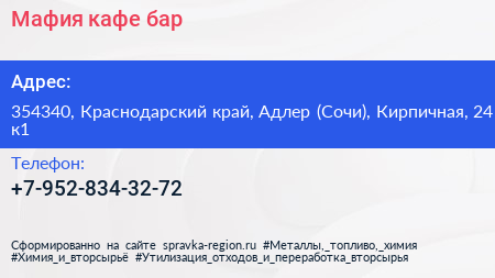 Мафия, кафе-бар по адресу 354340, Краснодарский край, Адлер (Сочи), Кирпичная, 24 к1 в дальнейшем Организация, размещена в следующих категориях: