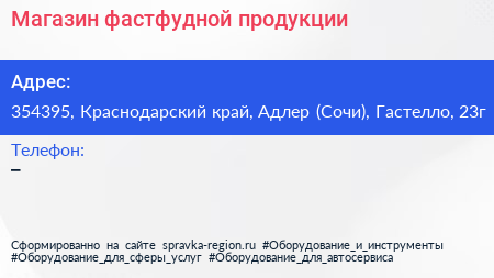 Магазин фастфудной продукции по адресу 354395, Краснодарский край, Адлер (Сочи), Гастелло, 23г в дальнейшем Организация, размещена в следующих категориях: