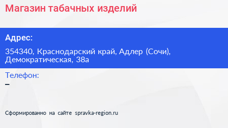 Магазин табачных изделий по адресу 354340, Краснодарский край, Адлер (Сочи), Демократическая, 38а в дальнейшем Организация, размещена в следующих категориях: