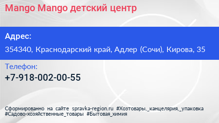 Mango Mango, детский центр по адресу 354340, Краснодарский край, Адлер (Сочи), Кирова, 35 в дальнейшем Организация, размещена в следующих категориях: