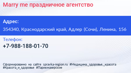 Marry me, праздничное агентство по адресу 354340, Краснодарский край, Адлер (Сочи), Ленина, 156 в дальнейшем Организация, размещена в следующих категориях: