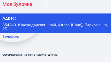 Моя булочка по адресу 354340, Краснодарский край, Адлер (Сочи), Пархоменко, 2Б в дальнейшем Организация, размещена в следующих категориях: