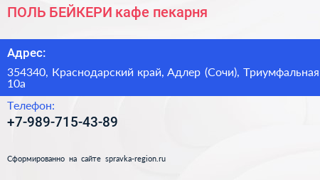 ПОЛЬ БЕЙКЕРИ, кафе-пекарня по адресу 354340, Краснодарский край, Адлер (Сочи), Триумфальная, 10а в дальнейшем Организация, размещена в следующих категориях: