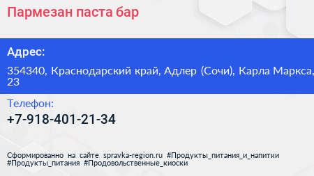 Пармезан, паста-бар по адресу 354340, Краснодарский край, Адлер (Сочи), Карла Маркса, 23 в дальнейшем Организация, размещена в следующих категориях: