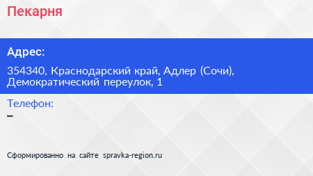 Пекарня по адресу 354340, Краснодарский край, Адлер (Сочи), Демократический переулок, 1 в дальнейшем Организация, размещена в следующих категориях: