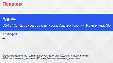 Пекарня по адресу 354340, Краснодарский край, Адлер (Сочи), Калинина, 30 в дальнейшем Организация, размещена в следующих категориях: