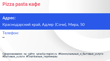 Pizza & pasta, кафе по адресу Краснодарский край, Адлер (Сочи), Мира, 50 в дальнейшем Организация, размещена в следующих категориях: