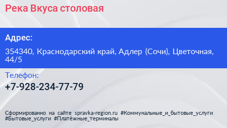 Река Вкуса, столовая по адресу 354340, Краснодарский край, Адлер (Сочи), Цветочная, 44/5 в дальнейшем Организация, размещена в следующих категориях: