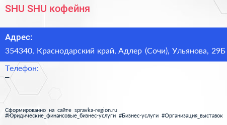 SHU SHU, кофейня по адресу 354340, Краснодарский край, Адлер (Сочи), Ульянова, 29Б в дальнейшем Организация, размещена в следующих категориях: