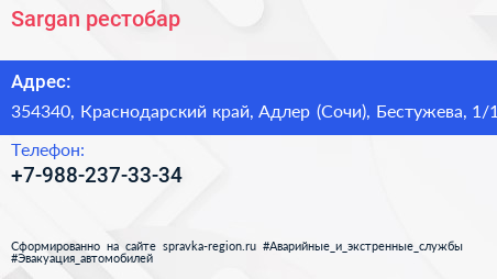 Sargan, рестобар по адресу 354340, Краснодарский край, Адлер (Сочи), Бестужева, 1/1 в дальнейшем Организация, размещена в следующих категориях: