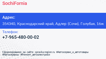 SochiFornia по адресу 354340, Краснодарский край, Адлер (Сочи), Голубая, 16ж в дальнейшем Организация, размещена в следующих категориях: