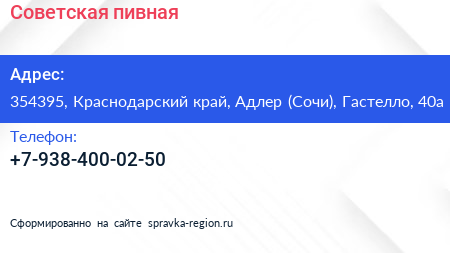 Советская пивная по адресу 354395, Краснодарский край, Адлер (Сочи), Гастелло, 40а в дальнейшем Организация, размещена в следующих категориях: