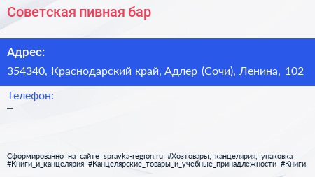 Советская пивная, бар по адресу 354340, Краснодарский край, Адлер (Сочи), Ленина, 102 в дальнейшем Организация, размещена в следующих категориях: