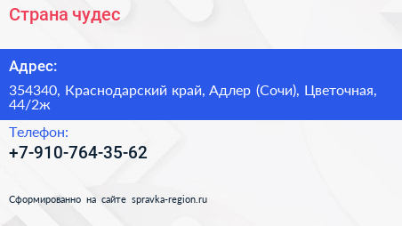 Страна чудес по адресу 354340, Краснодарский край, Адлер (Сочи), Цветочная, 44/2ж в дальнейшем Организация, размещена в следующих категориях: