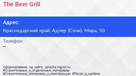 The Beer & Grill по адресу Краснодарский край, Адлер (Сочи), Мира, 50 в дальнейшем Организация, размещена в следующих категориях: