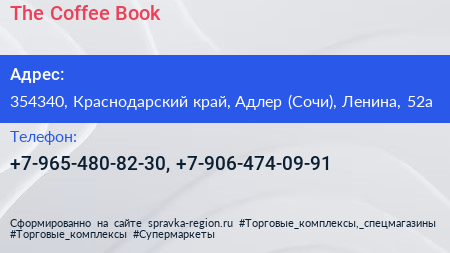 The Coffee Book по адресу 354340, Краснодарский край, Адлер (Сочи), Ленина, 52а в дальнейшем Организация, размещена в следующих категориях: