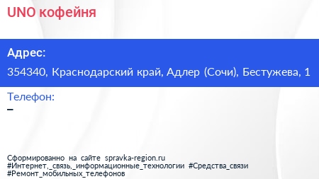 UNO, кофейня по адресу 354340, Краснодарский край, Адлер (Сочи), Бестужева, 1 в дальнейшем Организация, размещена в следующих категориях: