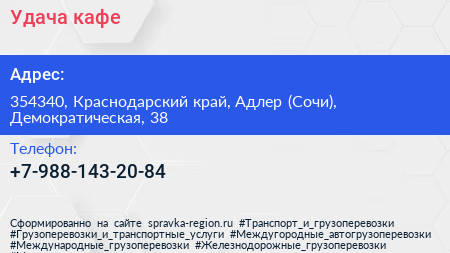 Удача, кафе по адресу 354340, Краснодарский край, Адлер (Сочи), Демократическая, 38 в дальнейшем Организация, размещена в следующих категориях:
