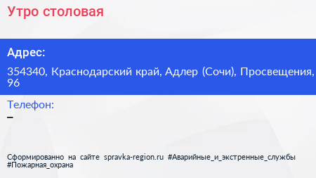 Утро, столовая по адресу 354340, Краснодарский край, Адлер (Сочи), Просвещения, 96 в дальнейшем Организация, размещена в следующих категориях: