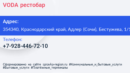 VODA, рестобар по адресу 354340, Краснодарский край, Адлер (Сочи), Бестужева, 1/1 в дальнейшем Организация, размещена в следующих категориях: