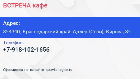 ВСТРЕЧА, кафе по адресу 354340, Краснодарский край, Адлер (Сочи), Кирова, 35 в дальнейшем Организация, размещена в следующих категориях: