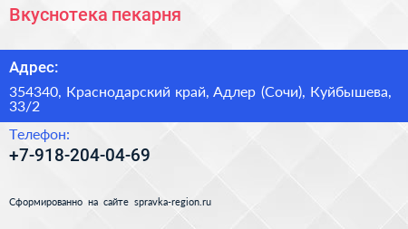 Вкуснотека, пекарня по адресу 354340, Краснодарский край, Адлер (Сочи), Куйбышева, 33/2 в дальнейшем Организация, размещена в следующих категориях: