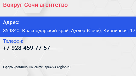 Вокруг Сочи, агентство по адресу 354340, Краснодарский край, Адлер (Сочи), Кирпичная, 17 в дальнейшем Организация, размещена в следующих категориях: