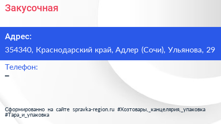 Закусочная по адресу 354340, Краснодарский край, Адлер (Сочи), Ульянова, 29 в дальнейшем Организация, размещена в следующих категориях: