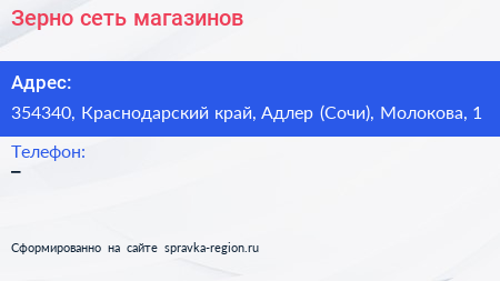 Зерно, сеть магазинов по адресу 354340, Краснодарский край, Адлер (Сочи), Молокова, 1 в дальнейшем Организация, размещена в следующих категориях: