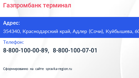 Газпромбанк, терминал по адресу 354340, Краснодарский край, Адлер (Сочи), Куйбышева, 60 в дальнейшем Организация, размещена в следующих категориях: