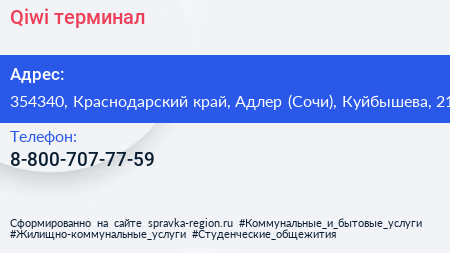 Qiwi, терминал по адресу 354340, Краснодарский край, Адлер (Сочи), Куйбышева, 21 в дальнейшем Организация, размещена в следующих категориях: