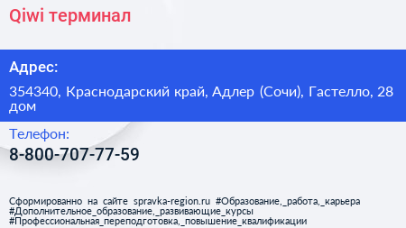 Qiwi, терминал по адресу 354340, Краснодарский край, Адлер (Сочи), Гастелло, 28 дом в дальнейшем Организация, размещена в следующих категориях: