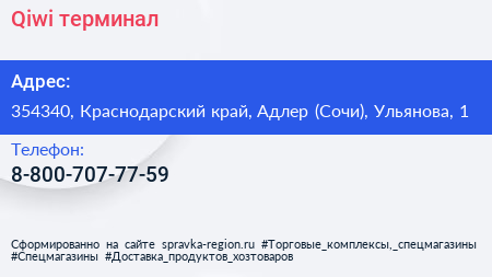 Qiwi, терминал по адресу 354340, Краснодарский край, Адлер (Сочи), Ульянова, 1 в дальнейшем Организация, размещена в следующих категориях: