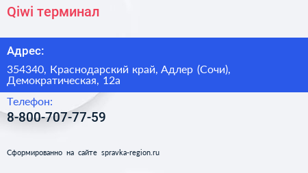 Qiwi, терминал по адресу 354340, Краснодарский край, Адлер (Сочи), Демократическая, 12а в дальнейшем Организация, размещена в следующих категориях: