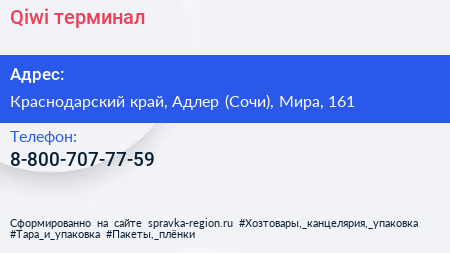 Qiwi, терминал по адресу Краснодарский край, Адлер (Сочи), Мира, 161 в дальнейшем Организация, размещена в следующих категориях: