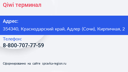 Qiwi, терминал по адресу 354340, Краснодарский край, Адлер (Сочи), Кирпичная, 2 в дальнейшем Организация, размещена в следующих категориях: