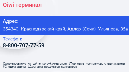 Qiwi, терминал по адресу 354340, Краснодарский край, Адлер (Сочи), Ульянова, 35а в дальнейшем Организация, размещена в следующих категориях: