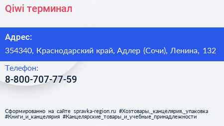 Qiwi, терминал по адресу 354340, Краснодарский край, Адлер (Сочи), Ленина, 132 в дальнейшем Организация, размещена в следующих категориях: