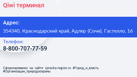 Qiwi, терминал по адресу 354340, Краснодарский край, Адлер (Сочи), Гастелло, 16 в дальнейшем Организация, размещена в следующих категориях:
