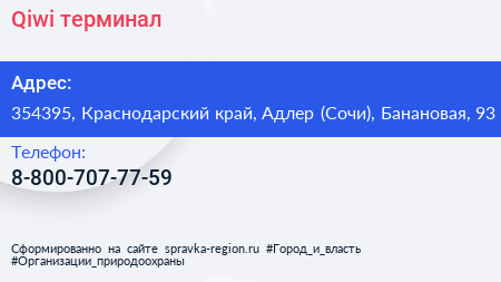 Qiwi, терминал по адресу 354395, Краснодарский край, Адлер (Сочи), Банановая, 93 в дальнейшем Организация, размещена в следующих категориях: