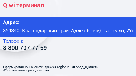Qiwi, терминал по адресу 354340, Краснодарский край, Адлер (Сочи), Гастелло, 29г в дальнейшем Организация, размещена в следующих категориях: