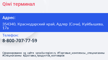 Qiwi, терминал по адресу 354340, Краснодарский край, Адлер (Сочи), Куйбышева, 17а в дальнейшем Организация, размещена в следующих категориях: