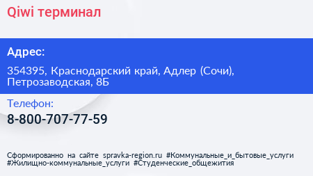 Qiwi, терминал по адресу 354395, Краснодарский край, Адлер (Сочи), Петрозаводская, 8Б в дальнейшем Организация, размещена в следующих категориях: