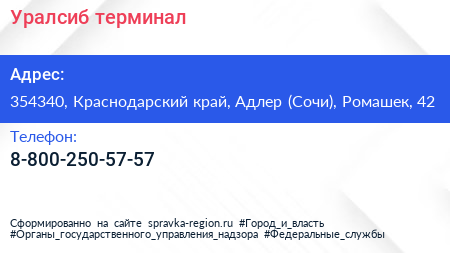 Уралсиб, терминал по адресу 354340, Краснодарский край, Адлер (Сочи), Ромашек, 42 в дальнейшем Организация, размещена в следующих категориях: