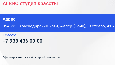 ALBRO, студия красоты по адресу 354395, Краснодарский край, Адлер (Сочи), Гастелло, 41Б в дальнейшем Организация, размещена в следующих категориях: